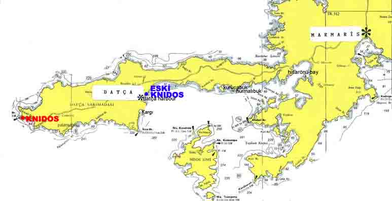Datça yarımadasının en uç kısmında Ege ile Akdeniz’in birleştiği noktada Tekir Burnu üzerine kurulan Knidos, antik dünyanın en zengin şehirlerinden biri imiş. Bulgulardan yaklaşık 5000 yıllık olduğu tahmin ediliyormuş. Efes’ten daha büyük bir şehir olmasına karşın hak ettiği ilgiyi göremediğinden bahsediliyor.