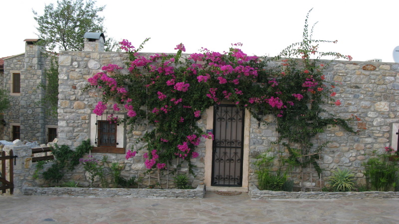 Evlerin tamamı taş, yollar bazen dar ve toprak patikalara dönüşüyor ancak her köşe başında karşınıza begonviller ve kaktüs meyveleri çıkıyor. Onun dışında kocaman kauçuk ağaçları, badem ağaçları, adım başı incir ağaçları, zeytinlerle yolu sokaklarda geziniyorsunuz. Bahçelerden meyve koparmak serbest. Benim ne derece incir delisi olduğumu bilen Adam her önünden geçtiğimiz ağaçtan birer ikişer incirleri kopararak beni bir güzel besledi. İncirlerin bazıları öyle güzel ki dalında kurumuş.  Hem yaş hem de kuru inciri bir arada yeme şansımız oldu.