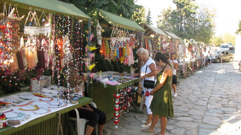 Hemen kahvenin yanından Eski Datça Mahallesinin içlerine doğru ilerleyen sokakta köylü kadınların tezgahları var.