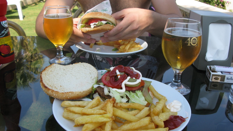 Hemen üzerimize mayolarımızı geçirip bu sefer soluğu havuz kenarında aldık. Sabah erken kalkmış olmanın ve yolun verdiği açlık duygusunu bastırmak için birer hamburger bir de bira söyledik. Hamburger ve patates kızartması bana hep plajda yenecek en güzel şeymiş gibi gelir. Tahminimce hamburger köfteleri pınar köfte idi ama turşusu, domatesi, yeşilliği yerinde bir hamburgerdi. Patates kızartmalarında da kızartılan yağın tazeliğini kokusunu alabiliyordunuz.