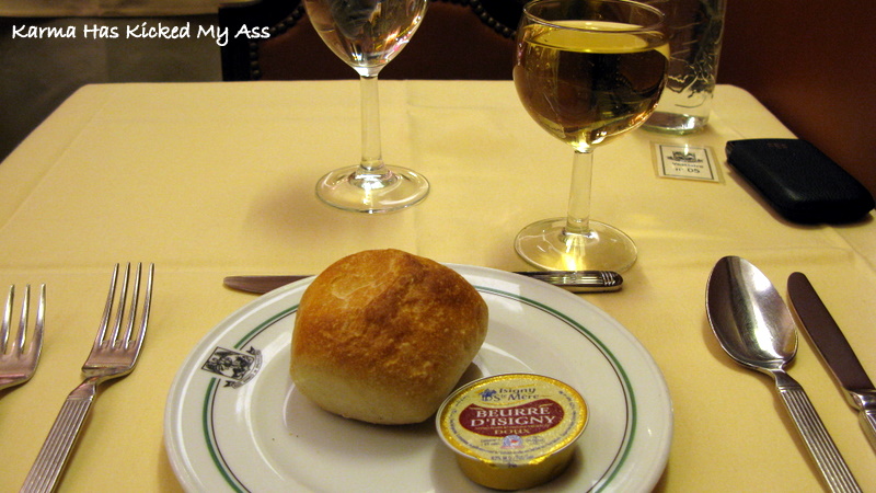 Menü geliyor ve ben öncelikle bir kadeh beyaz pouilly fumé söylüyorum. Bu benim çok beğendiğim bir üzüm ve şaraptan ilk yudumu aldığımda da ne kadar doğru bir seçim yaptığımı anlıyorum. Yemekten önce masaya adet olduğu üzere ekmek ve tereyağı geliyor.