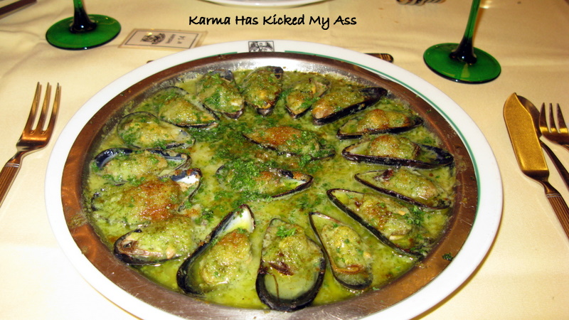 Bunlar ise onlara gelen başlangıç yemekleri. İlk gördüğünüz Les Moules a l’Escargot. Türkçe çevirisi Salyangoz usulü Midye olmasına karşın bu tabakta salyangoz yok.
