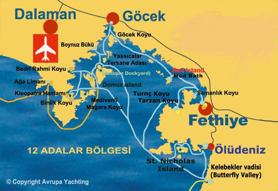 Yukarıda Fethiye körfezini detayları ile görüyorsunuz. Fethiye limanından çıkan tekneler haritadan da rahatlıkla görebileceğiniz üzere iki farklı istikameti izliyorlar. Bunların bir kısmı 12 Adalar turu adı altında Göcek ve civarındaki adaları turlarken, diğerleri güneye saparak Ölüdeniz, Kelebekler Vadisi tarafına süzülüyorlar. Kelebekler Vadisi Turları genelde Ölüdenizden kalkıyor.