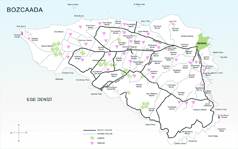 42 km büyüklüğündeki adayı çevreleyen sahilin uzunluğu 14 mil. Bu 14 mili 12 burun ve 12 koy süslüyor. Adanın rüzgarları meşhur o nedenle yazın sıcağından bunalanlara sunduğu buz gibi ferah tertemiz, pırıl pırıl bir denizi var. Ada tek ilçeden oluşuyor. Köy yok. Merkezdeki ilçeyi kabaca Türk ve Rum mahallesi olarak ikiye bölmek mümkün.