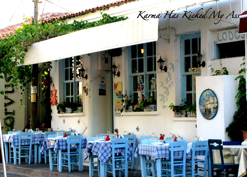 Adadaki restoranlardan biri var resimde,  ara sokaklarda gerçekten çok hoş mekanlar var… Asma yaprakları gölge etmiş kimisine, beyaz örtüler serilmiş masaların üzerine, samimi sohbetler için beklemekteler bizi…