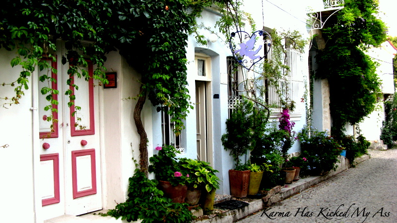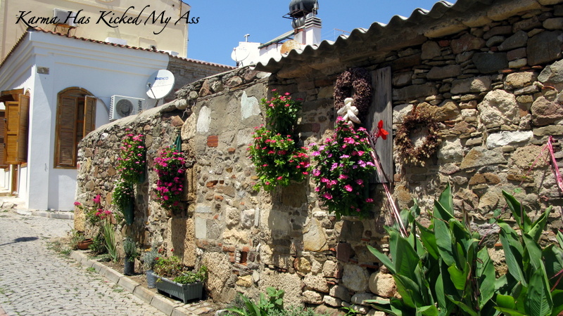 Rüzgar Güllerini (modern yel değirmen 🙂 görüp burada bir kadeh ada şarabını, ezine peyniri eşliğinde yudumladıktan sonra Ada merkezine geri döndük ve rehberimizle birlikte 4 kişi ada sokaklarını turlamaya başladık. Normal sezonda turların minimum 30 kişiyle yapıldığını düşününce bu özel tur çok da hoşumuza gitti.