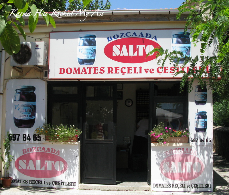 Ve tabi bir de domates reçeli meselesi var.. tadı kireçte kabak tatlısına benziyor… daha önce yediğim havuç reçelini de andıran bir tadı var… adanın en ünlü dükkanı burası… Simyon Salto’nun dükkanı.. Domates reçelinin mucidi… İlk üreticisi… Simyon Salto aynı zamanda adanın Rum cemaatinin de başkanlığını yapmış uzun yıllar boyunca…. Bu yıl Nisan ayında hayata gözlerini yummuş.