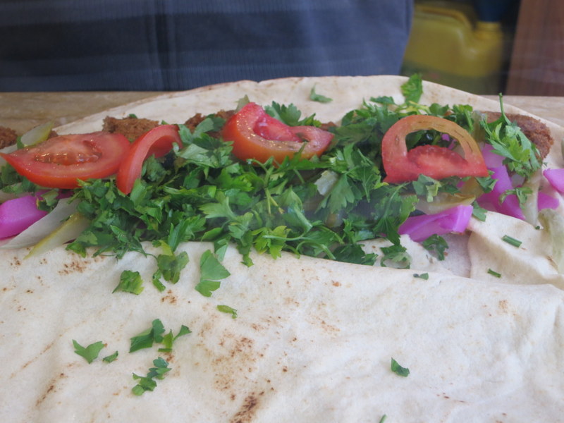 Üniversitenin kampüsünden çıktığımızda karnımız zil çalıyordu. Sabahtan beri yola çıkarken yanımıza aldığımız annemin mevyeli kek ve kuru kayısılar dışında bir şey yememiştik. Ara sokaklarda düzgün bir felafelci ararken, gelmeden önce Cukurcumatimes’ta okuduğumuz Abou Al Tayeb karşımıza çıkıverdi. Hızımızı alamayıp felafeli büyük boy söyledik. Zorlansak da nerede ise hepsini bitirdik. Ancak dürümün içindeki yeşillik ve domatesleri o kadar fazla koymuşlardı ki bir kısmını çıkarmak zorunda kaldık.