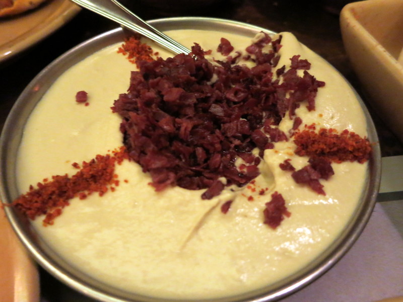 Patlıcan salatası bildiğimiz gibi, ardından gelen pastırmalı humus da güzel ama üzerindeki pastırmayı söylememize gerek yokmuş. Sade de gayet güzel yenirmiş.
