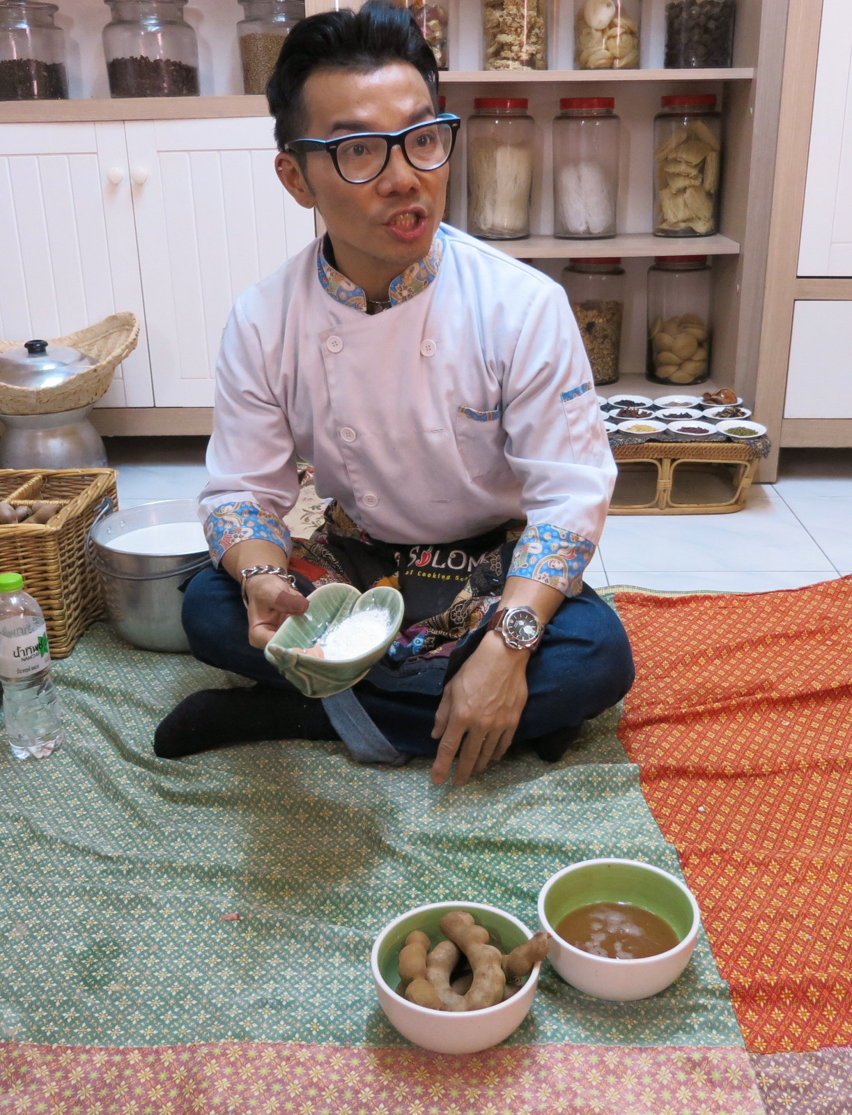 Bangkok Pazar AlışverişiKolumuzdaki minik sepetleri doldurduktan sonra  Slom Thai Cooking School’un yolunu tuttuk. Girişte eve girer gibi ayakkabılarımızı çıkardık ve iki gruba ayrılarak kendi mutfaklarımıza yollandık ve bir daire olup, yere oturduk…