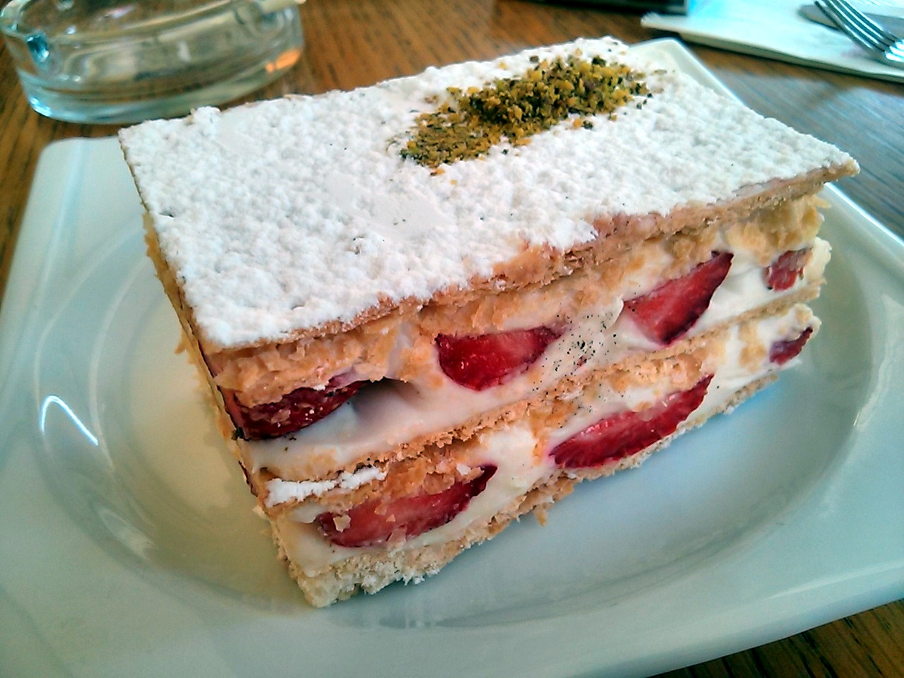 Yeşilçay’ın sadece poğaçaları değil, börekleri, özellikle kıymalı kol böreği, çekirdekli simiti, ve tatlıları da birbirinden muazzam. Ne ararsanız var. Bir defasında çilekli pastalarına vurulmuştum. Bir başka seferinde güllaçına, sütlü nuriyesine. Aşağıda gördüğünüz milföylü çilekli pasta ve profiterolü midemize indirdikten sonra içimiz bayıldı biraz da üzerine börek yiyelim diyerek garsonları da şoka soktuğumuz gün anladım ki ben Yeşilçay Pastanesinin en büyük hayranlarından biriyim.