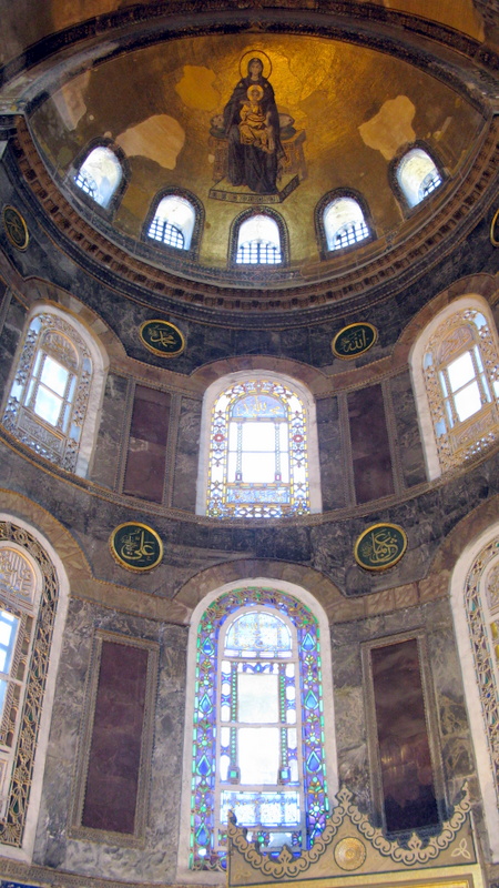 Biz geçen haftasonu yukarıda dediklerimin hepsini yaptık. Tramvayla Sultanahmet’e gelip, müze kartımızı Aya Sofya’dan aldık ve içeri daldık. Aya Sofya’nın 532-537 yılları arasında 10.000 işçi ve 100 usta tarafından yapıldığını biliyor muydunuz? Fatih İstanbul’u fethedene kadar Rum Ortodoks Patrikhanesi buradaymış. Fatih ilk iş burayı camiye dönüştürmüş. 1935 senesinde Atatürk tarafından müzeye çevirmiş. Tahmin edebileceğiniz üzere içeride Türkten çok yabancı turist var.
