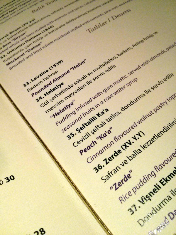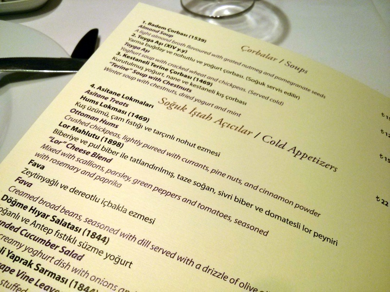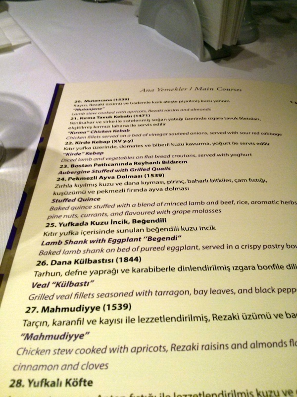 Menüye siz de gözatmak ister miydiniz? Yemeklerin yanında yazan yıllar o tarifin hangi tarihe ait olduğunu gösteriyor. Çok heyecan verici değil mi? Muhteşem Yüzyıl’ın rating rekorları kırdığı dönemde bile Asitane’nin adının çokça duyulmaması şaşırtıcı. Anlayabildiğim kadarı ile yerlilerden ziyade turistlerin uğrak yeri olan bir restoran burası. Menüde çorbalar, başlangıçlar, ara sıcaklar, ana yemekler ve tatlılar var. Menüleri içki açısından da zengin.