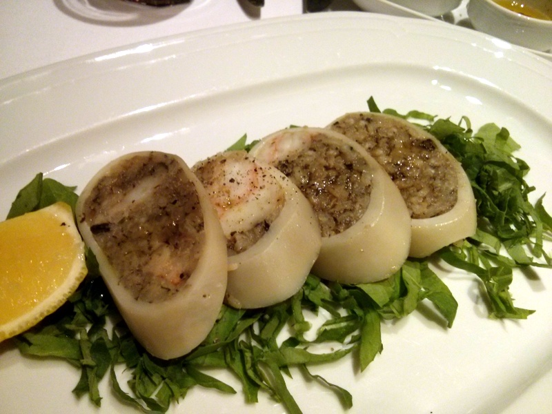 Bundan sonraki tabak şaşırtıcı.. Osmanlı’nın kalamar ve karides tükettiğini burada öğreniyoruz… Buyrun size karidesli kalamar dolması. Hem de kuş üzümlü, fıstıklı…