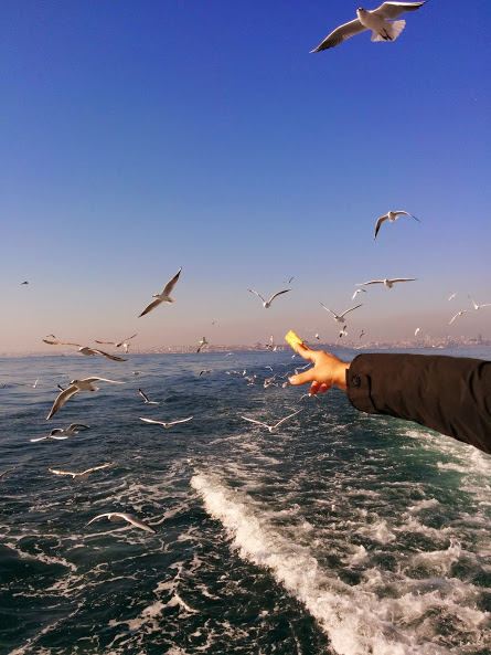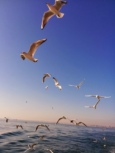 Adaya giderken vapurun peşinden süzülen martılar zaten insanın ruh halini değiştirmek için birerbir. Balık yerine ekmek, çizi, simitle beslenen İstanbul martıları bu konuda öyle ustalaşmış ki Adam’ın elindeki çizileri kapıp götürdüler. Görüntüler şahane, gülümsemek bedava.