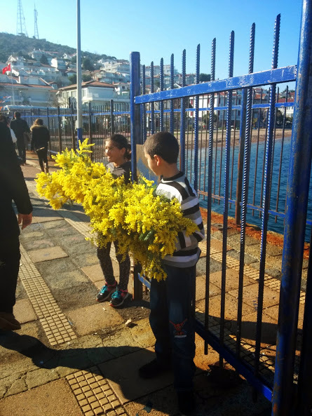 Ada karşılama heyeti bizi iskelede mimozalarla karşıladı. Erken ısınan havaların etkisiyle adadaki ağaçlar çılgıncasına çiçek açmışlar. Çocuklar da açan çiçeklerin demetini 5 TL’ye satıyorlar. Geldiğinizde değil ama bizim gibi dönerken alırsanız evinize ada kokusu götürebilirsiniz. Tabi bu anlattıklarım Mart ayında olduğu için şu anda gitseniz yine mimoza bulur musunuz emin değilim amd başka çok güzel çiçeklerle karşılanacağınızı tahmin ediyorum.