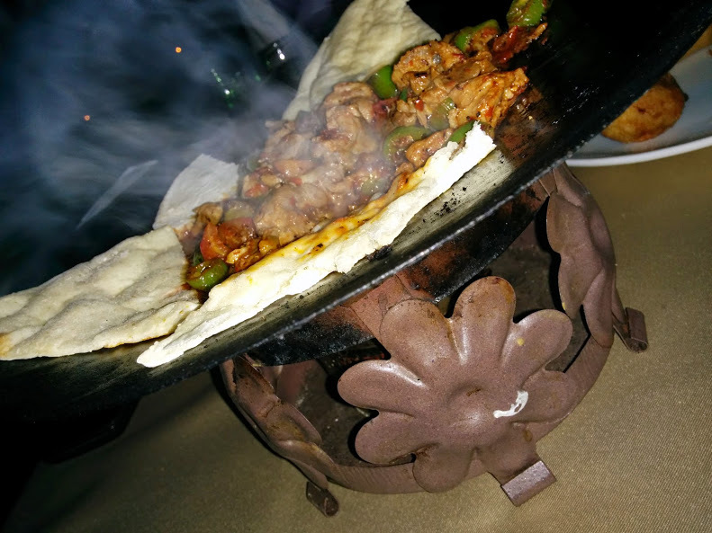 Erdebil Köşkü - Sac TavaBurada yemeğimizi yedikten sonra bu defa yeniden şehre inerek Sülüklü Han’a uğruyoruz. Burada karafla geliyor Süryani şarabı arkada nefis müzikler çalıyor. Ben şaşıp kalıyorum… Zaman ve mekan uçuyor gidiyor… İnanılmaz bir atmosfer… Demirci atölyelerinin arasında ama akşam saat geç olduğu için dükkanlar kapanmış. Kapıdan giriyoruz, sağ tarafta bir eski kapı duvara asılmış. Üzerinde beş dille yazılmış  bir hitabe var: Süryanice, Ermenice, Zazaca, Kırmançe ve Türkçe kullanılmış. Keşke hatırlayabilsem ne yazdığını ama aklımda kalmamış. İçeride kadın, erkek, başı örtülü, açık herkes bir arada.