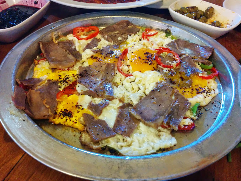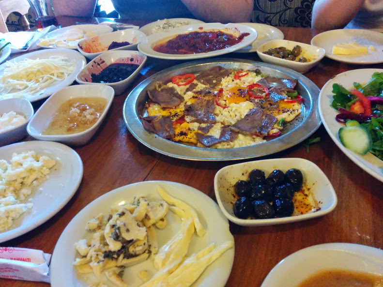 Hasan Paşa HanıKahvaltı Mustafa’nın Kahvaltı Dünyası’nda buluşacağız tur rehberi ve grupla ama onlar henüz gelmemişler. Bizi önden bir masaya alıyorlar, sonra başlıyorlar servise. Masa doldukça doluyor. Servis tabağında yer kalmıyor. Bana sorarsanız bu kadar kalabalık bir masadansa daha az ama öz tabaklarla masayı doldurmayı tercih edebilirim.  19 Mayıs kalabalığının etkisiyle iğne itseniz yere düşmeyecek kıvamda handaki bütün kahvaltıcılar.  O yüzden böyle bir tatil zamanını beklemeyip herhangi bir haftasonu giderseniz büyük ihtimalle daha çok zevk alırsınız.