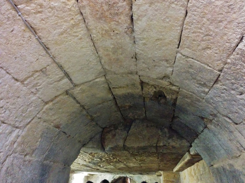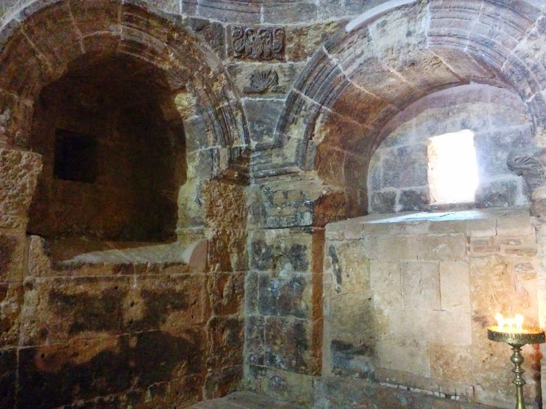 Manastırın içerisinde Kubbeli Kilise, Meryem Ana Kiliseleri ve Azizler Evi’nin yanısıra bir de güneş tapınağı bulunmakta. Güneş tapınağının M.Ö. 4000 yılından kaldığı söyleniyor. Aşağıda gördüğünüz güneş tapınağının tavanı. Tüm yapıyı oluşturan taşların arasında herhangi bir harç vesaire kullanılmamış. Taşlar verev kesilerek sıkıştırılmış ve doğal bir kilit sistemi oluşturmuşlar. Yerin altındaki bu tapınağın üzerindeki taşların ağırlığının 500 ton olduğu söylendi bize. İnanılmaz değil mi? 500 tonu duyunca insanın içine bir ürperti doluyor. Hem etkilenerek hem de acaba ben buradayken çöker mi diye korkarak inceliyorum duvarları.