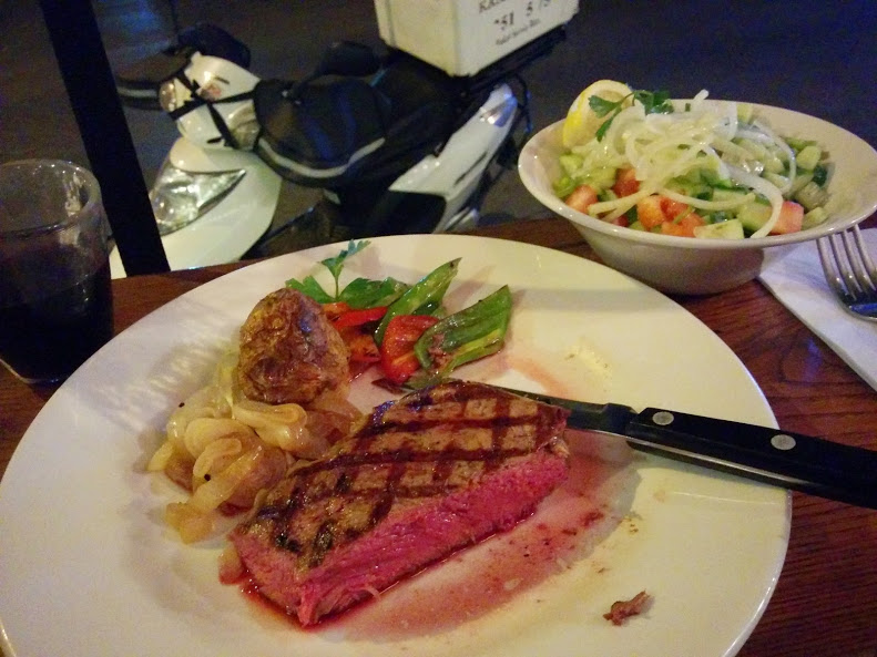 Kasabım: Bir Cuma akşamı dışarı çıksak mı çıkmasak mı diye nerede ise 2 saatten uzun süren bir ikilemin arkasından ha gayret diyerek kendimizi Cihangir’e attık. Amaç, önce biraz yemek yedikten sonra o bar senin bu bar benim gezmek. Akarsu caddesinin piyasa mekanlarının tamamının dolu olmasını da fırsat bilip, uzun zamandır önünden geçtiğim ama bir türlü içeri girmediğim Kasabım’a yöneldik. Burası gerçekten de bir kasap. Biz bonfile istedik ama epeyce masaya iskender gittiğini de gördük. Et güzel, az pişmiş isteyince gerçekten az pişmiş getiriyorlar. Fiyatlar normal et restoranlarındaki seviyede. Hızlıca yemek yiyip kalkmak istiyorsanız mantıklı bir seçim.