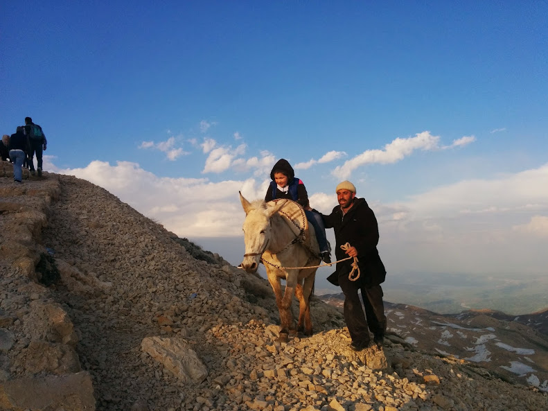 Araçla zirveye yaklaşılabilen en uç noktaya vardığımızda güneşin batışına 1 saat 15 dakika gibi bir süremiz kalmıştı. Burada bir kafe ve katır taksi sizi bekliyor. Yaklaşık 600 metrelik tırmanışı kendiniz yapmak istemezseniz 30 TL karşılığında katır taksiyle yukarı çıkabiliyorsunuz. Bana sorarsanız yavaş yavaş dura dura çıkıp arada manzarayı izlemek en güzeli. Acele etmeye kalktığınızda nefesiniz kesiliyor gerçekten de ve eğim fazla olduğu için yol tam bir eziyete dönüşüyor. Orta yaşın epey üzerindeki teyzelerin dahi dura dura zirveye çıktıklarını gördüm o nedenle buraya kadar geldi iseniz zavallı katırlara yük olmaktansa kendi temponuzu belirleyerek yukarı çıkmanız en doğrusu.