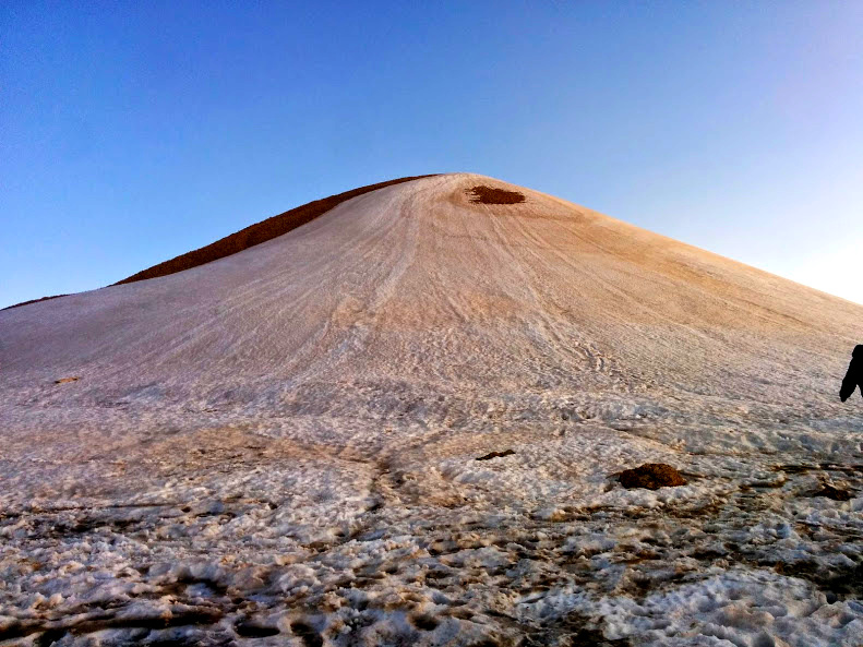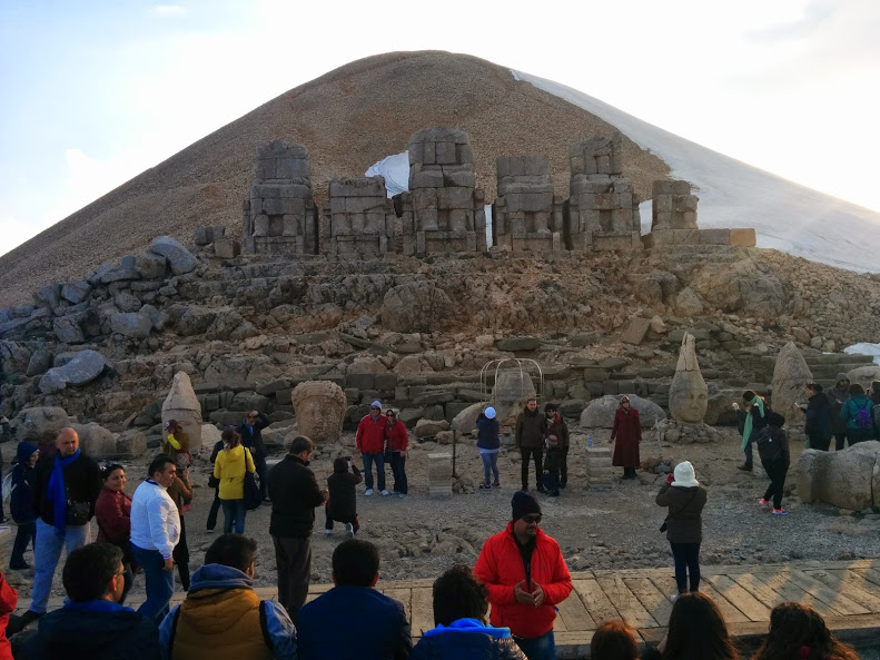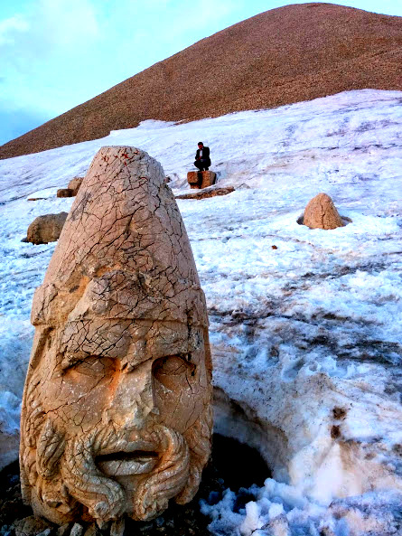 Gelmeden önce okuduğum bir blogda insanların güneş doğuşunu ya da batışını izlemek için buraya şarapları ile geldiklerini okumuştum. Harika fikir diyerek İstanbul’dan gelirken getirmek için bir şişe kırmızı şarabı getirmeyi planlamıştım ancak ne yazık ki evde unutmuşum. Tümülüsün bulunduğu noktaya tırmanmadan evvel hediyelik eşyalar satan dükkanda şarap sattıklarını da görünce bir şişe alıp, orada açtırdık ve plastik bardaklarımızla birlikte yukarı tırmanmaya başladık. Dura dura tepeye çıktığımızda dağın zirvesinin bir yanının hala karlarla kaplı olduğunu görmek gerçekten sürpriz oldu. Daha sadece bir ay kadar önce tipiye yakalandığımız Kapadokya seyahatini düşünüp gülmeden edemedik. Meğer bizden bir hafta önce Nemrut’ta zirveye çıkanlar burada tipiye yakalanmışlar ve kurtarma ekiplerinden yardım istemek durumunda kalmışlar!