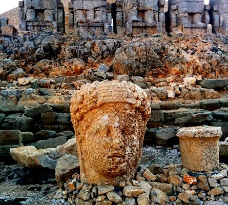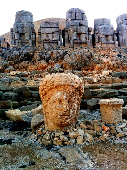 Aradan geçen yüzyılların etkisi, depremler ve zirvedeki sert iklim koşulları heykellere epeyce zarar vermiş. Aslında yukarıda gördüğünüz tahtların üzerinde ki kafaların tamamı yere düşmüş. Hatta yine bir kaynağa göre tümülüsün 75 metre olan yüksekliği de burada yapılan kazı çalışmaları esnasında zarar görerek 50 metreye kadar inmiş. Zamana karşı güçlükle ayakta duran bu güzelim heykellerin bu iklim koşullarına ne kadar daha dayanabileceği meçhul. O yüzden herkes bir an evvel gidip görmeli bence. Aşağıda kafesin içinde gördüğünüz Zeus’un kafası, nerede ise dağılmak üzere!