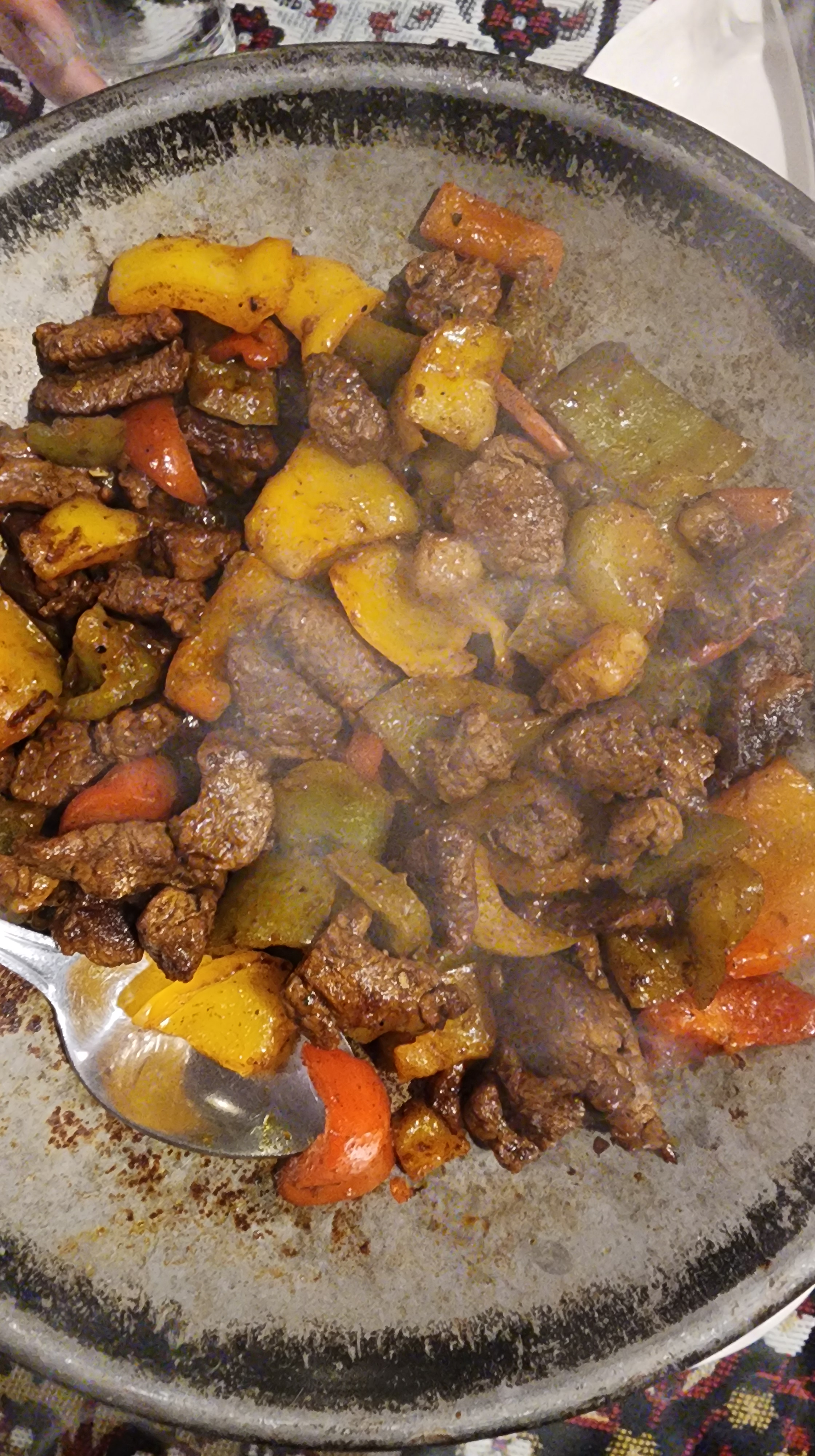Odaya çıkıp biraz dinlendikten sonra, saat 6’da akşam yemeği için buluştuk. Wesam, bizi kendi başımıza gitsek asla bulamayacağımız ufak ve samimi bir restorana götürdü. Masaya, bizim saç kavurmaya benzer iki yemek geldi; biri tavuklu, diğeri dana etli. Her şey o kadar lezzetliydi ki neredeyse parmaklarımızı da birlikte yiyecektik!
