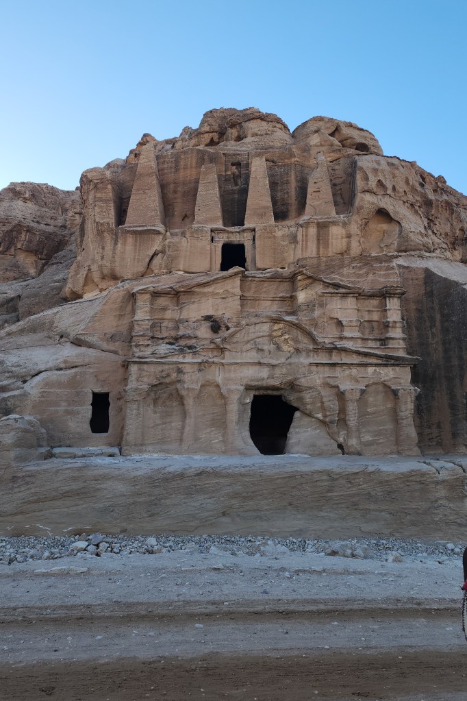 Şimdi gelelim Petra hakkında öğrendiklerimize: Dünyanın yeni 7 harikasından biri seçilen Petra, Yunanca “kaya” anlamına geliyor. Bu bölge, tarih öncesi dönemlerden bu yana bir yerleşim yeri olarak kullanılmış. Önce avcı-toplayıcı gruplar bu bölgede yavaş yavaş yerleşik hayata geçmiş, ardından bölge, kervan yolları üzerinde önemli bir durak haline gelmiş. Şehrin bir yanı Mezopotamya’ya, diğer yanı ise Mısır’a uzanıyor. Bakın mesela bu aşağıdaki mezar anıtının ismi Obelisk Mezar. Mezarın üst kısmındaki dört obeliskten dolayı bu isim verilmiş ve Nebatilerin dini ve mimari stilini yansıtan önemli bir yapı olduğu söyleniyor. Buradaki 4 obelisk bize içeride 4 mezar bulunduğunu anlatıyor.