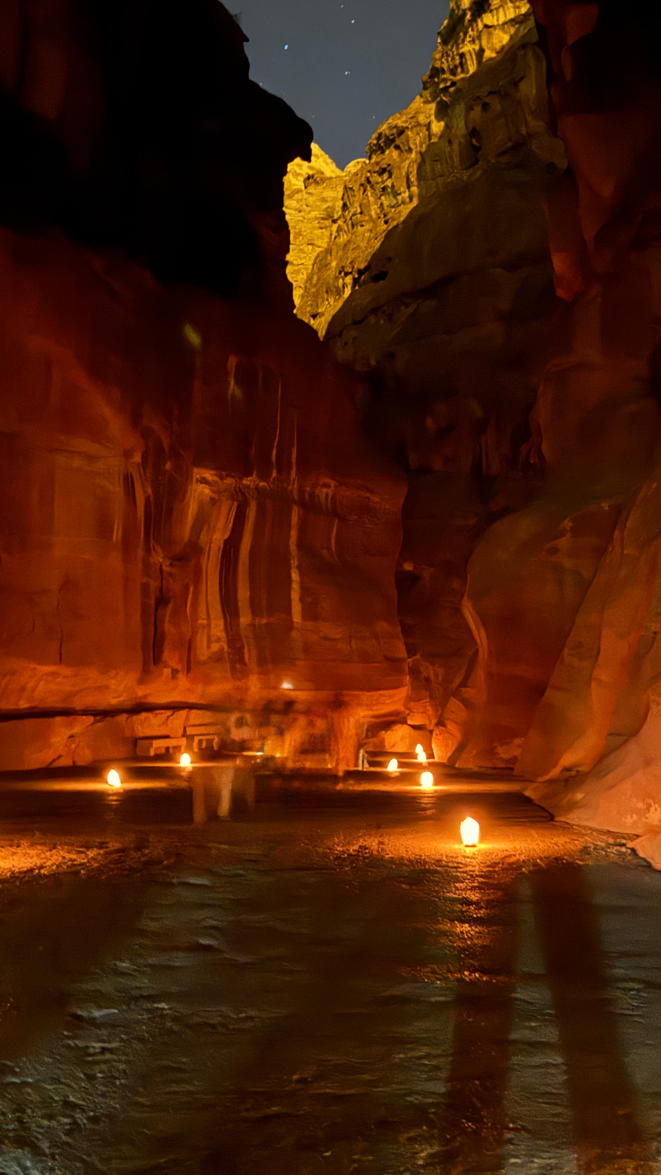 Yemekten sonra Petra’nın giriş kapısına geldik. Görevliler saat 20.15 gibi sıraya giren grubu içeri almaya başladılar. Böylece, karanlıkta Hazine Binası’na doğru yürümeye başladık. Ekim ayının sonlarına yaklaştığımız için gece hava Wadi Musa’da oldukça serin ve rüzgârlıydı. Üstelik Petra, tam bir vadinin içine kurulu olduğu için rüzgâr daha da sert hissediliyordu. Yol epeyce karanlıktı, kenarlara koydukları portatif aydınlatmalar yolu aydınlatmak konusunda yetersizdi. Cep telefonunun feneri ile yürümek gereksiz kazaları engellemek için iyi bir seçenek.