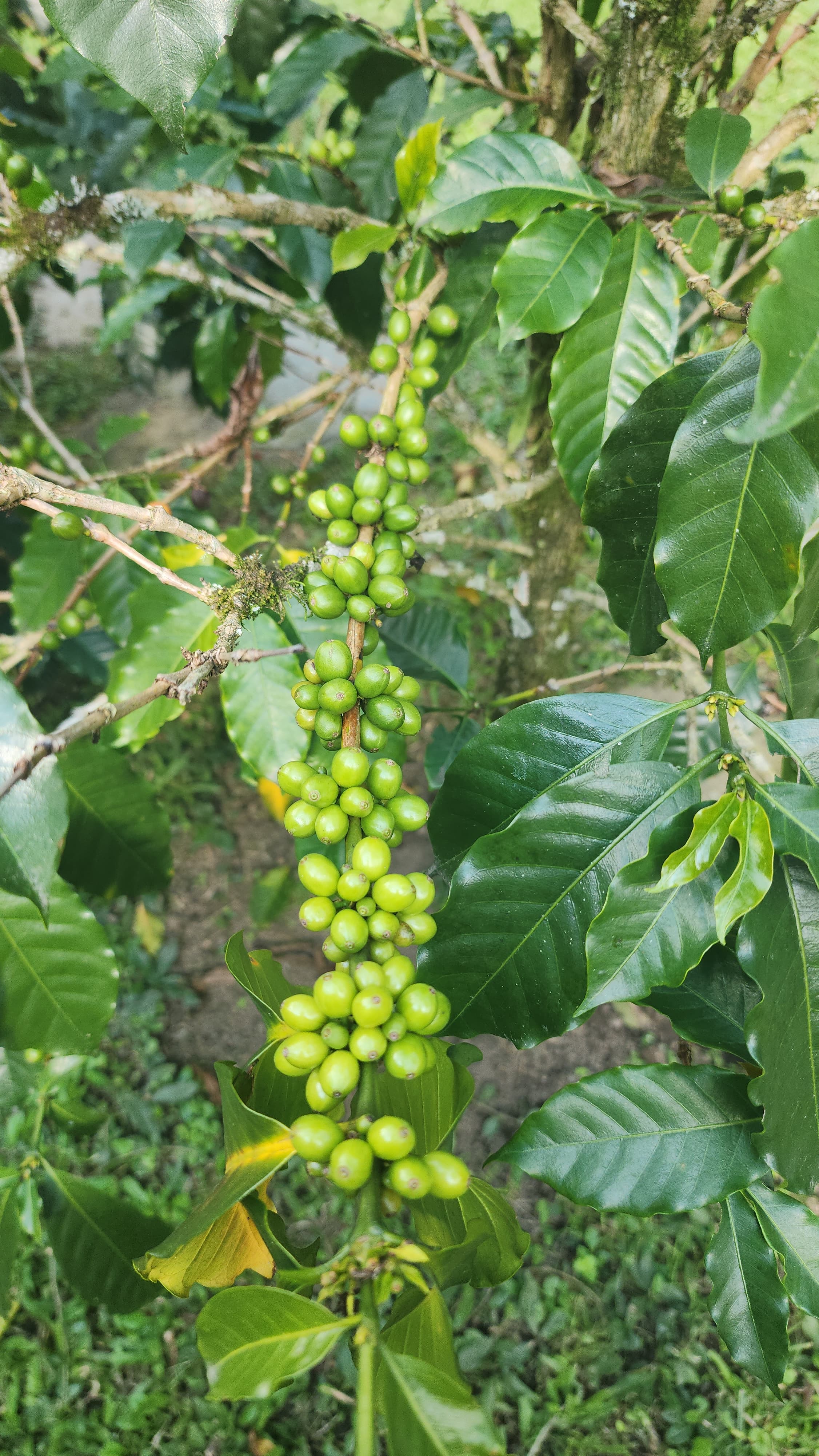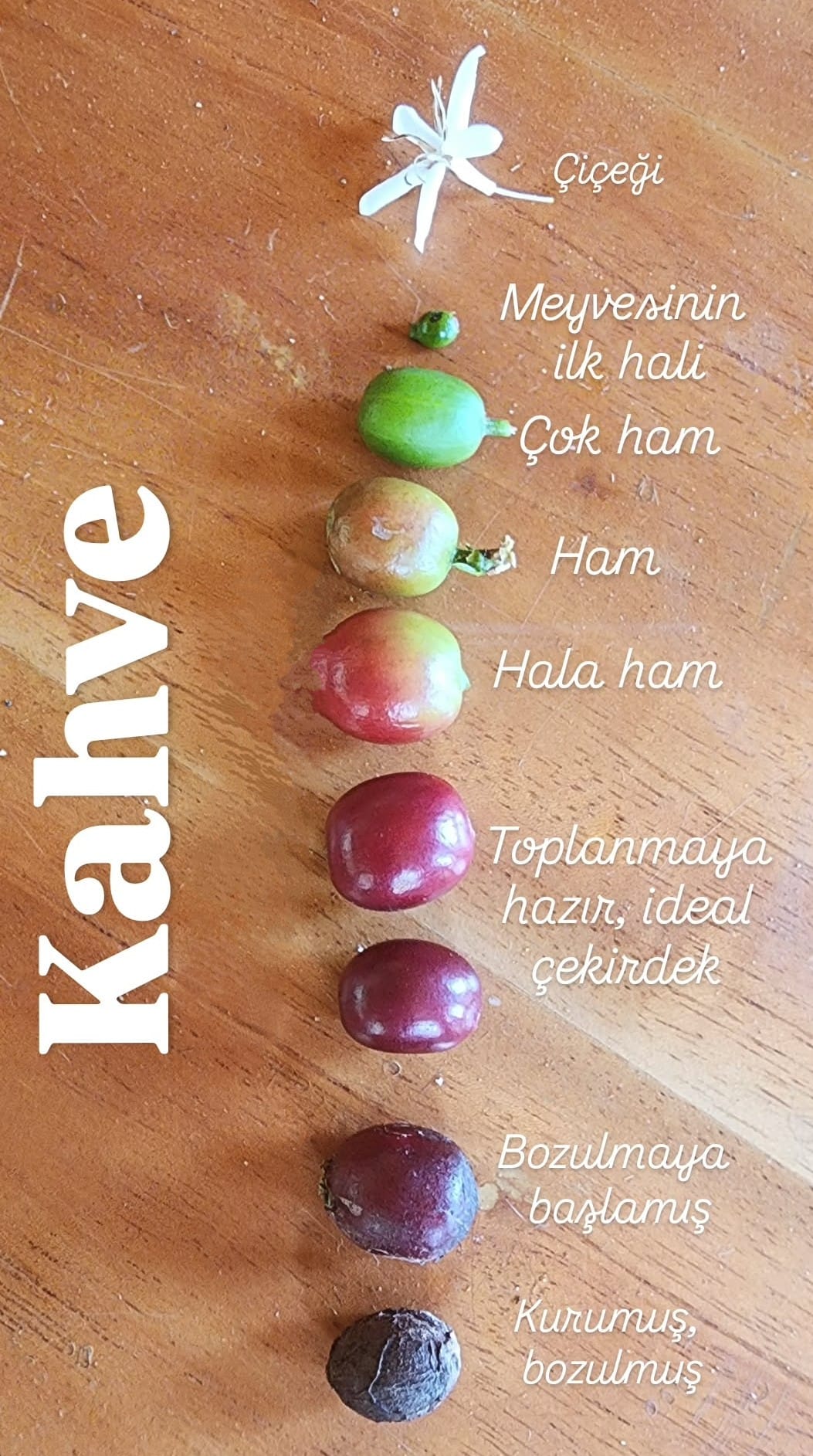 Kahve çiçeğinin ömrü sadece 3 günmüş. Bu kısa ömürden sonra, yeşil renkli minik bir kahve meyvesi ortaya çıkar ve bezelye tanesi büyüklüğüne ulaşana kadar yavaş yavaş renk değiştirerek olgunlaşırmış. Toplanmaya hazır haldeki bordo renkli kahve çekirdeğinin bu kabuğu çıkarıldığında altından beyaz, jölemsi, şekerli adına “müsilaj” dedikleri bir ikinci katman çıkıyor. Bu aslında kahvenin içindeki şeker. Eğer kahve iyi bir üretim sürecinden geçebildi ise çekirdek bu musilajın içerisindeki şekerin bir kısmını alıkoyarmış. Bu da kahvenin acı değil, tatlı ve hatta bir miktar ekşi, limonlu bir tada sahip olmasını sağlarmış.